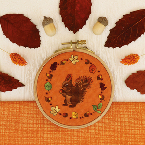 roestrood borduur je een lief eekhoorntje omringd door blaadjes en eikeltjes.