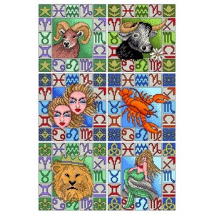 Patroonvel van A3 formaat incl. garenlijst met diverse motiefjes om te borduren: Ram, Stier, Tweelingen, Kreeft, Leeuw en Maagd.