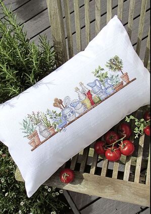 Patroonvel van A3 formaat incl. garenlijst met diverse motiefjes om te borduren: keukenkruiden, keukengerei, pannenlap, kip, azijn, kop, vis, krab, groenten, citroen, aubergine, olie, chili, haan, ui, kreeft, theedoek, garnalen, venkel