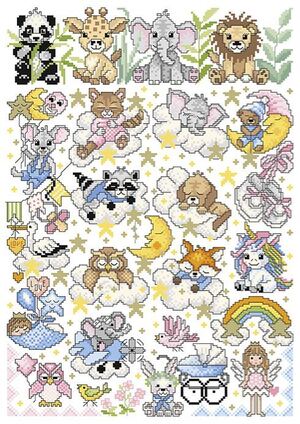 Patroonvel van A3 formaat incl. garenlijst met diverse motiefjes om te borduren: muis, elf, baby, eenhoorn, ballonnen, regenboog, uil, ooievaar, panda, vogel, maan, wolken, kinderwagen, vliegtuig, sterren, hoed, konijn, hond, vos, kinderschoenen, kat, bloem, giraf, olifant, leeuw, wasbeer.
