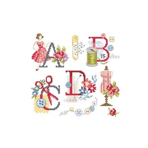 De letters worden ook begeleid door silhouetten en accessoires van Vintage stiksels. De grootte van de letters is ongeveer 50 bij 50 kruisjes.