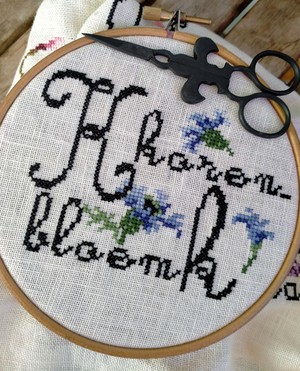 Linnen stof Belfast (32ct) Zweigart (No. 222), DMC Mouliné. Borduurnaald met stompe punt nr. 22-24. Borduurschaartje. Rijggaren.