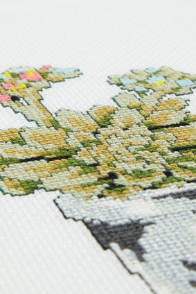 AFWERKING: Leg het borduurwerk met de goede kant naar beneden op een zachte doek of handdoek en pers het voorzichtig op met een stoomstrijkijzer of met behulp van een vochtige doek.