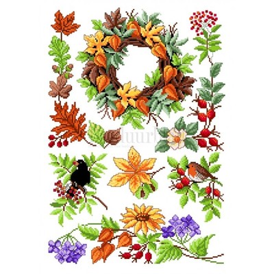 Patroonvel van A3 formaat met diverse motiefjes om te borduren: herfsttakken, vogels, bloemen.