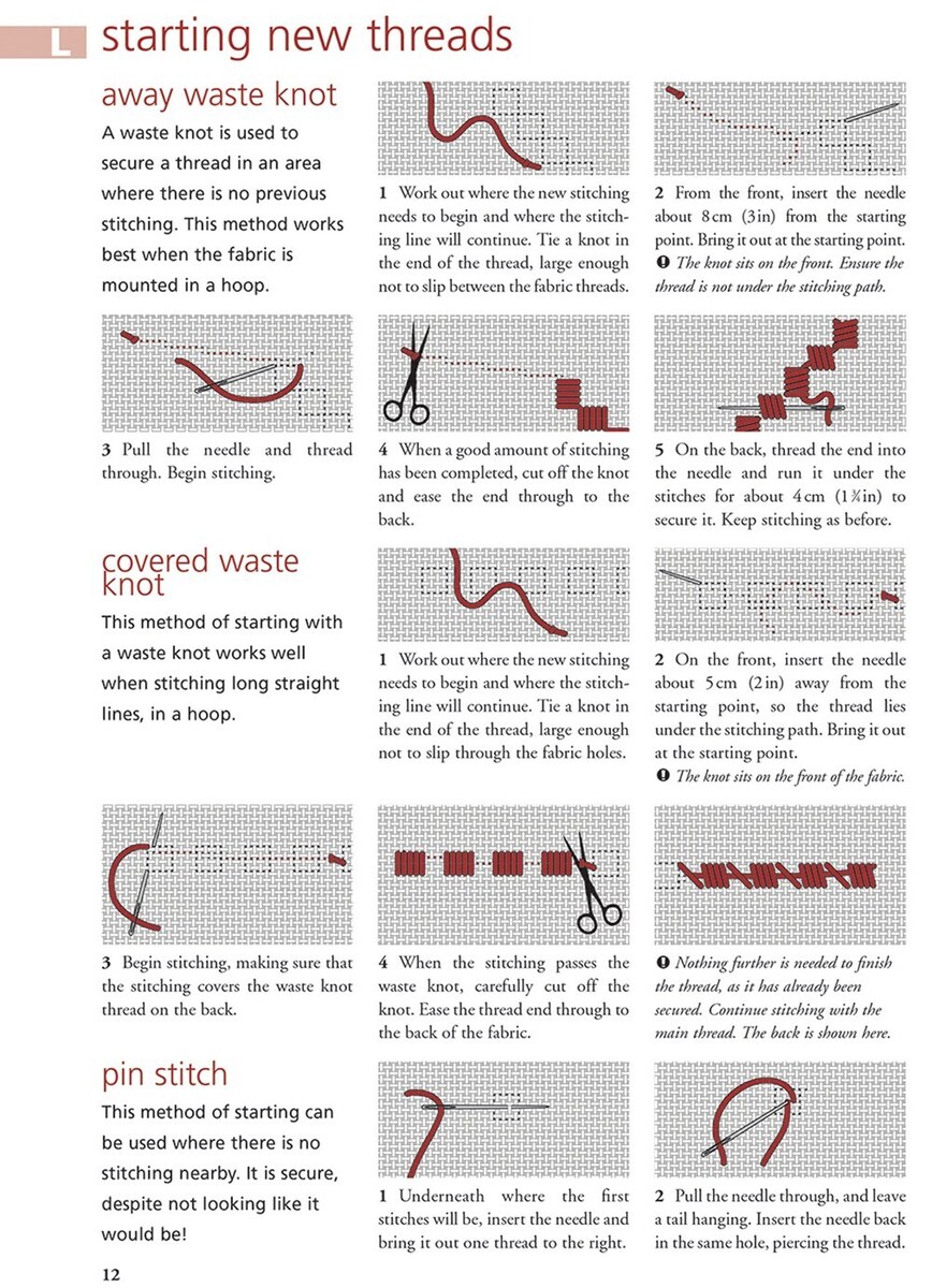 en rechtshandige (blauw) instructies voor elke steek. De