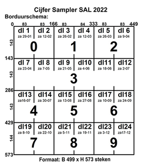 B 499 (79,2 cm) x H 573 steken (91 cm) geborduurd op 12 dr. / 6,3 st. p. cm.