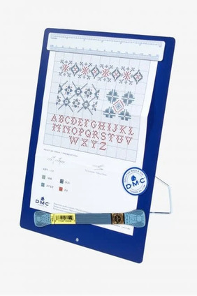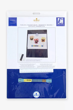 Magneet bord om je borduurpatroon op vast te klemmen, werkt ook gelijk als naaldmagneet. Met een standaard rechtop te zetten. Er zitten 3 magneten op, een in de vorm van een liniaal een in de vorm van DMC garen strengetje en een in het logo van DMC. Formaat: 28 x 38 cm