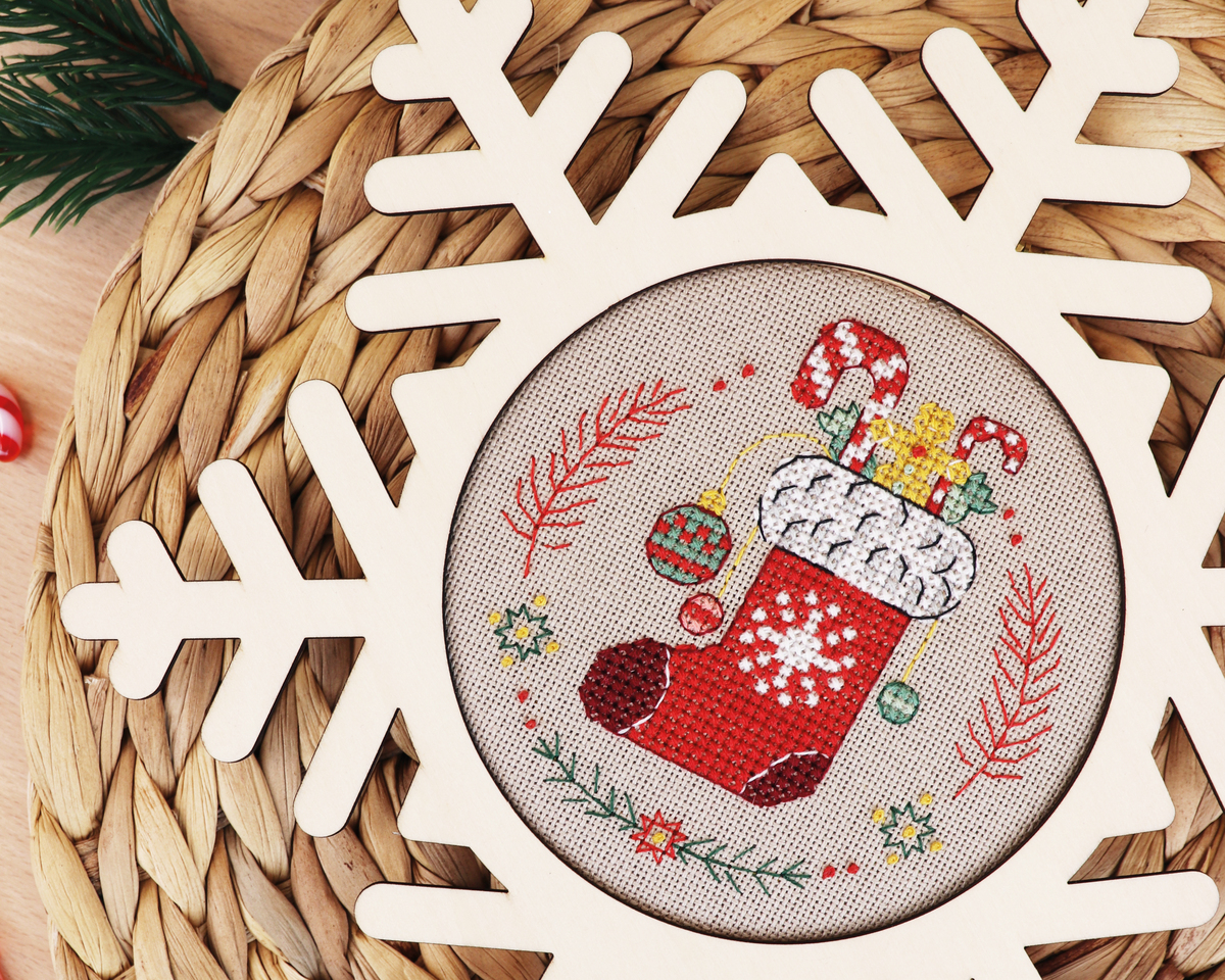 • Houten sneeuwvlokframe of borduurring (ca. 13–15 cm Ø)
