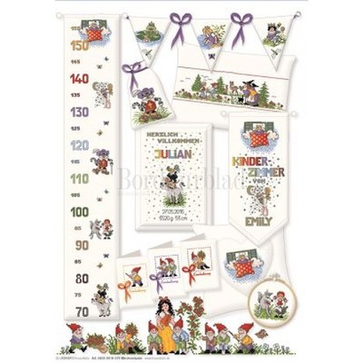 Patroonvel van A3 formaat met diverse motiefjes om te borduren: kabouters, dieren, sprookjesfiguren.