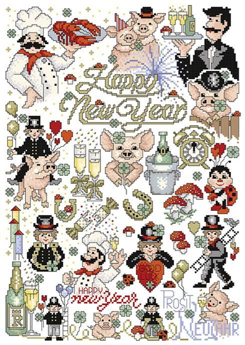 Patroonvel van A3 formaat incl. garenlijst met diverse motiefjes om te borduren: Gelukkig nieuwjaar, kok, hoefijzer, kolibrie, ober, champagne, biggetje, lieveheersbeestje, feestknaller, klavertjevier, gelukspaddestoel, schoorsteenveger, klok, hart, vuurwerk.