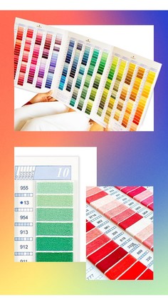 Een musthave voor elke borduurliefhebber: de stalenkaart van DMC met kleuren van Mouliné Spécial, Mouliné Color Variations, Mouliné Effet Lumiére, Coton Perlé en Perlé Métallisé.