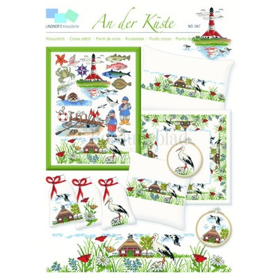Patroonvel van A3 formaat incl. garenlijst met diverse motiefjes om te borduren: vissen, meeuwen, visboer, schaaldieren, schip, bloemen, reigers, vuurtoren.