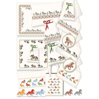 Patroonvel van A3 formaat incl. garenlijst met diverse motiefjes om te borduren: paarden, ruiter, randen, alfabet.