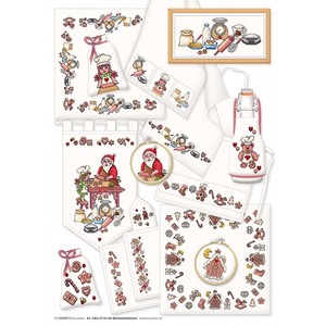 Patroonvel van A3 formaat incl. garenlijst met diverse motiefjes om te borduren: lekkernijen, bakgerei, koekjes, gebak.