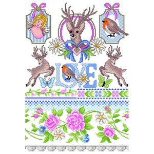 Patroonvel van A3 formaat incl. garenlijst met diverse motiefjes om te borduren: herten, vogels, paddestoelen, randjes, vlinders.