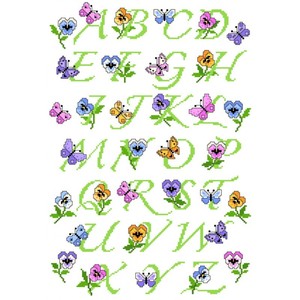 Patroonvel van A3 formaat incl. garenlijst met diverse motiefjes om te borduren: viooltjes, alfabet, vlinders.
