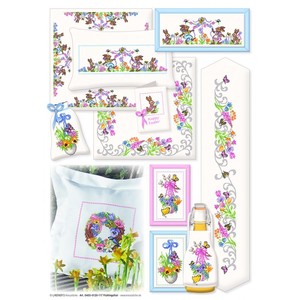 Patroonvel van A3 formaat incl. garenlijst met diverse motiefjes om te borduren: konijntjes, bloemen, krans, vlinders.