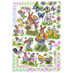 Patroonvel van A3 formaat met diverse motiefjes om te borduren: hazen, kuikens, vlinders, bloemen, randjes.