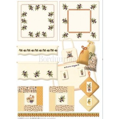 Patroonvel van A3 formaat met diverse motiefjes om te borduren: olijven, kannen, takken, boompjes, citroenen, randjes.