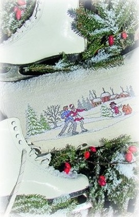 Patroonvel van A3 formaat incl. garenlijst met diverse motiefjes om te borduren: winter, landschapjes, schaatsen, randjes, huisjes, vogels.