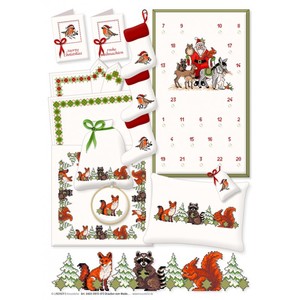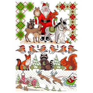 Patroonvel van A3 formaat incl. garenlijst met diverse motiefjes om te borduren: Kerst, dieren, uil, hert, ezel, haas, vogels, wasbeer, vos, eekhoorn, rendieren, kerstman, huisjes, randjes.