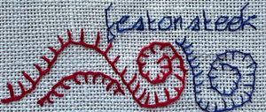 Nan: “Ik moet eerlijk zeggen, de festonsteek is niet moeilijk, maar het kiezen van de juiste positie voor je naald is soms wel moeilijk te zien. Ik werd er wat onrustig van en maakte onder de tekst op deze bladzijde gewoon festonsteken waarbij het niet precies uitmaakt waar je je naald in de stof steekt. En dat is eigenlijk ook wat we nastreven met ons stekenboekje: we willen leren wat ‘losser’ te werk te gaan. Ik geef je een afbeelding van wat ik onder de tekst maakte, maar dat hoeft dus niet exact nagemaakt te worden. Maak vooral je eigen slingertjes!”