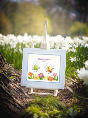 borduurwerk van Vervaco, met twee vrolijke bijtjes in een